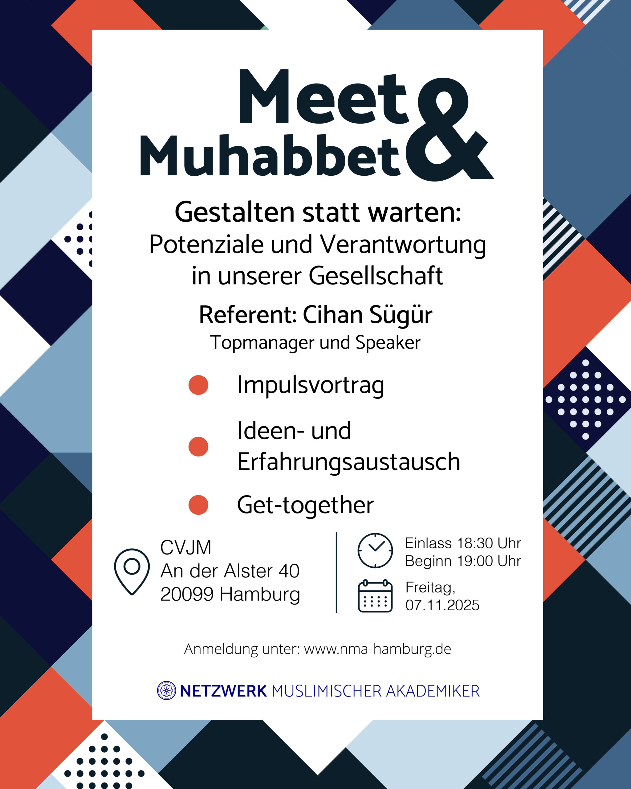 Save the Date: 07.11.25! Unter dem Motto „Gestalten statt warten: Potenziale und Verantwortung in unserer Gesellschaft.“ laden wir herzlich zum nächsten Meet & Muhabbet ein. Als Akademiker tragen wir Verantwortung für eine starke Gesellschaft – Gestalten heißt: anpacken, verbinden, bewegen. Gemeinsam bringen wir unsere Gesellschaft voran.
